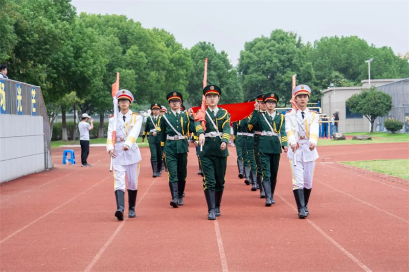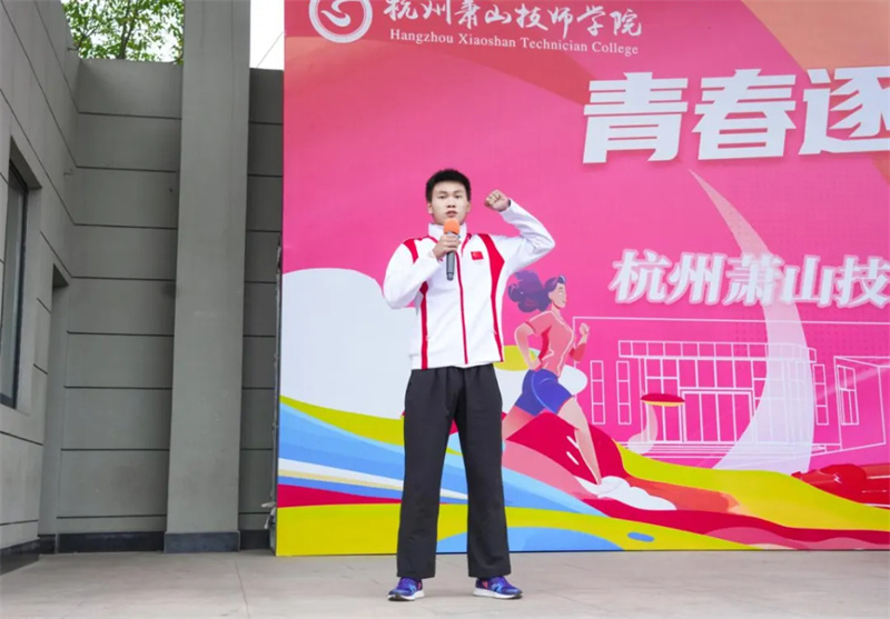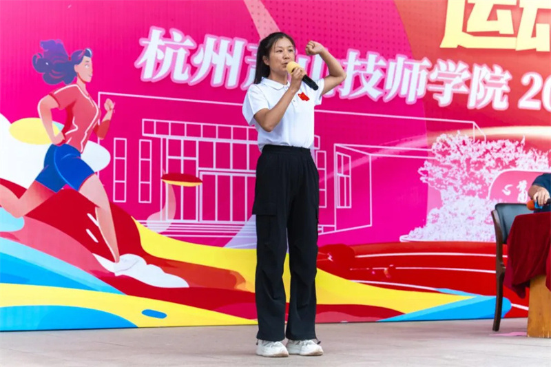 2413班丁熠杰同學代表運動員莊嚴宣誓:“遵守規則,友誼第一,賽出水平,賽出風采!” 擲地有聲的誓言點燃全場熱情。最后,徐巨峰書記高聲宣布:“杭州蕭山技師學院第 24 屆運動會正式開幕!” 話音未落,全場歡呼雷動。